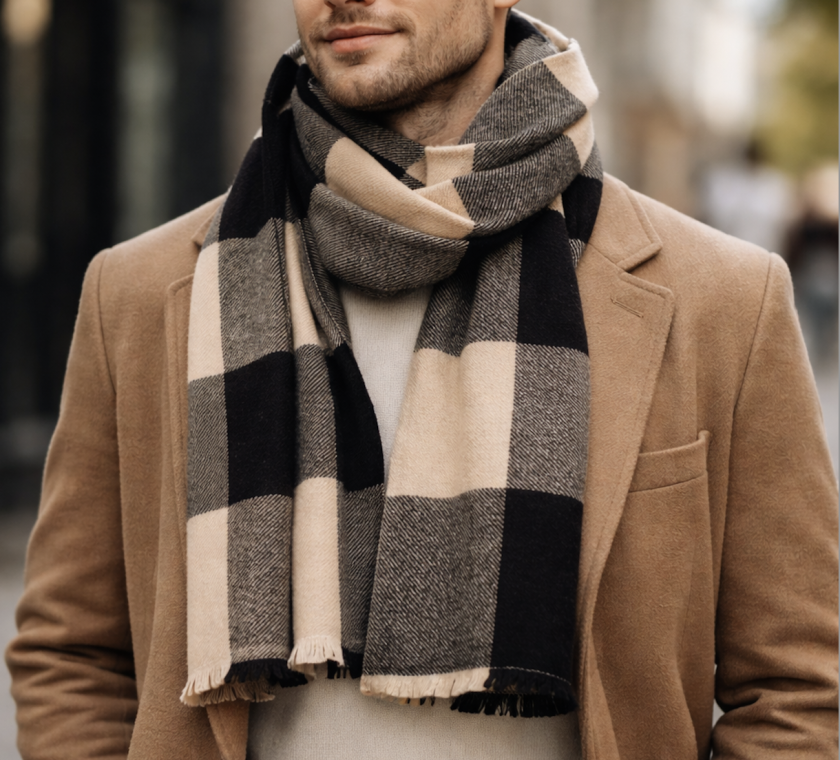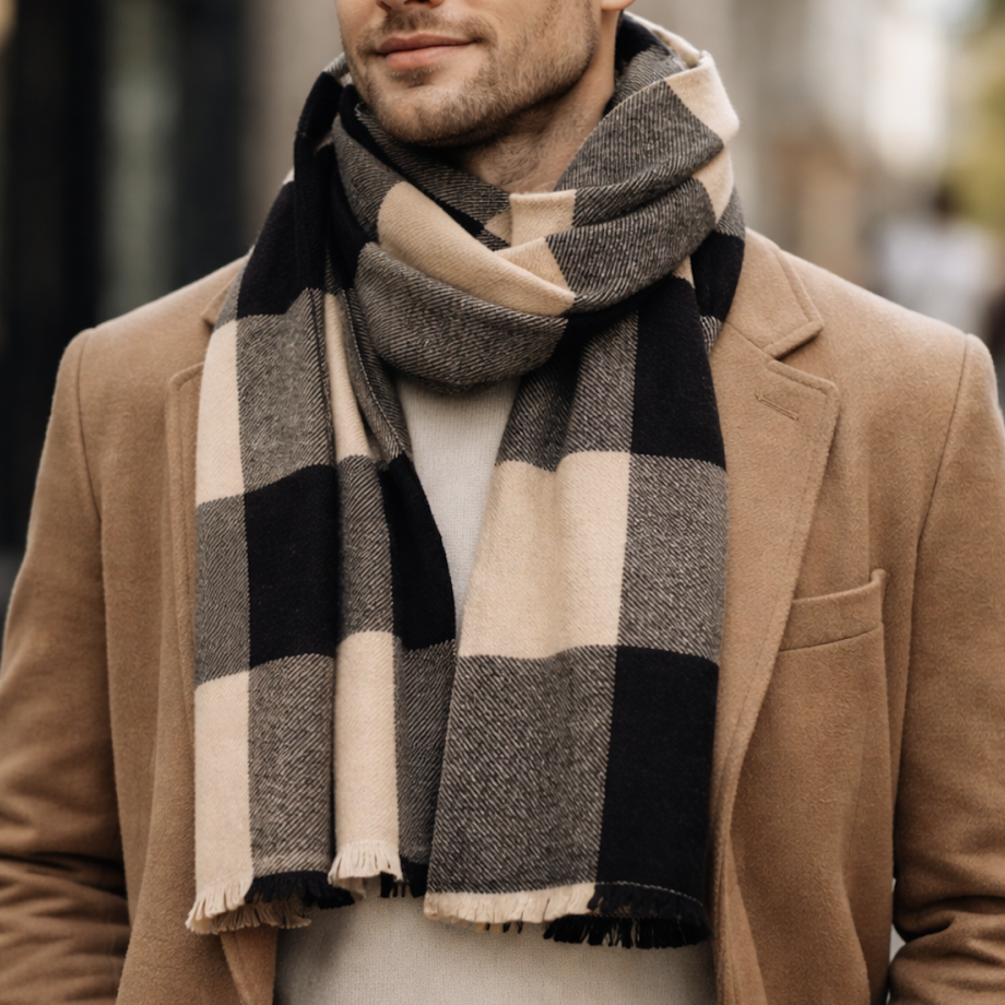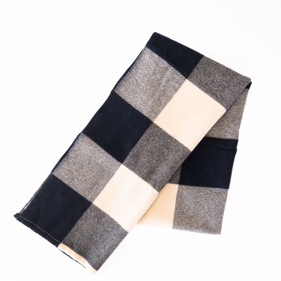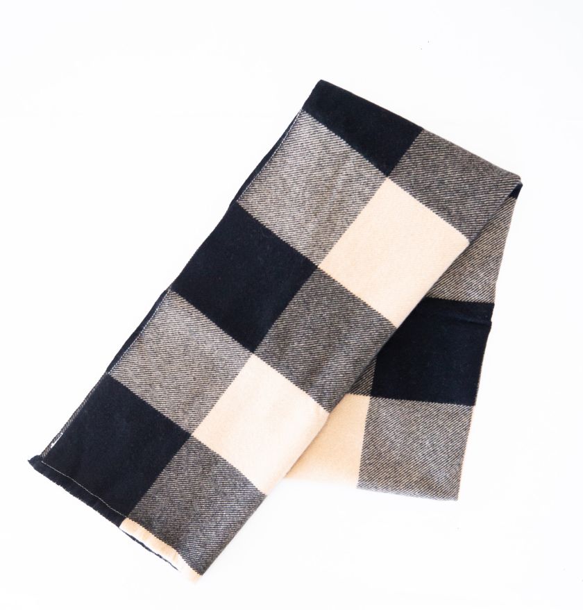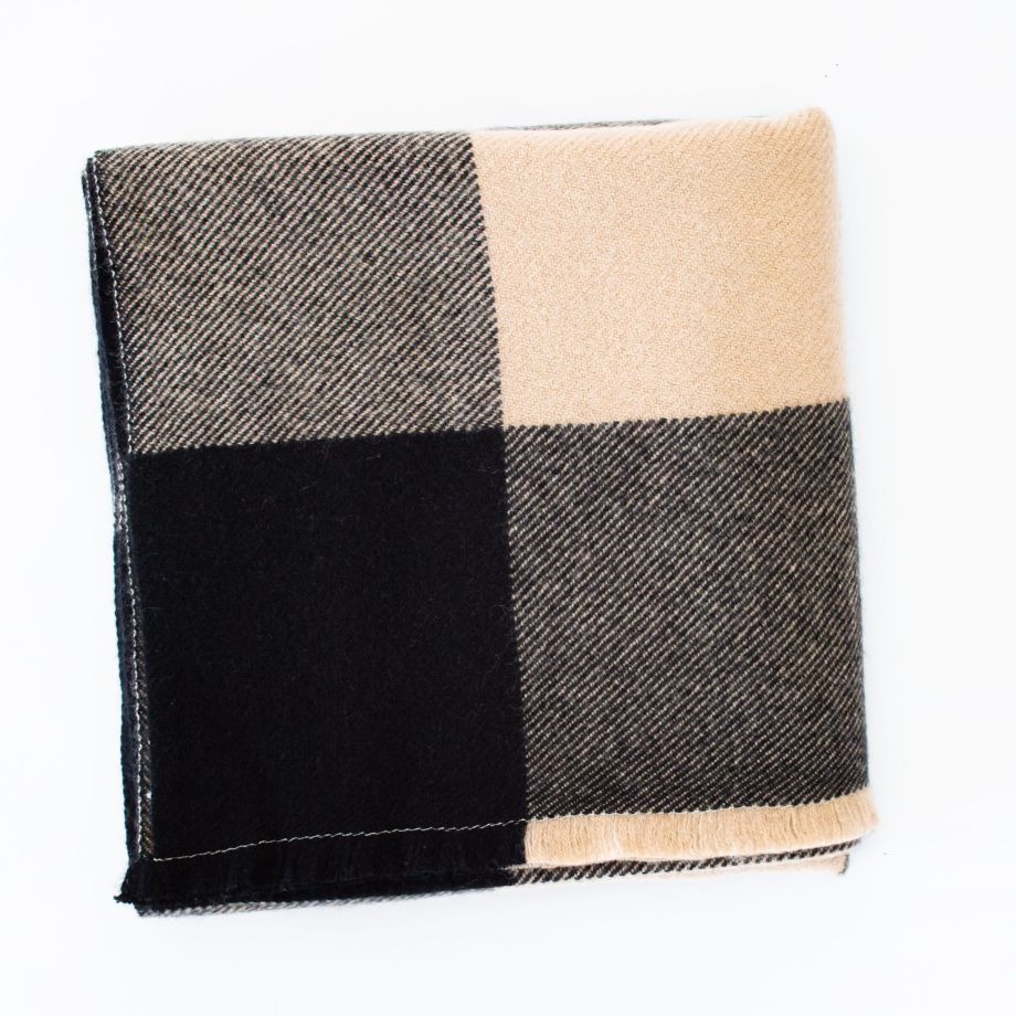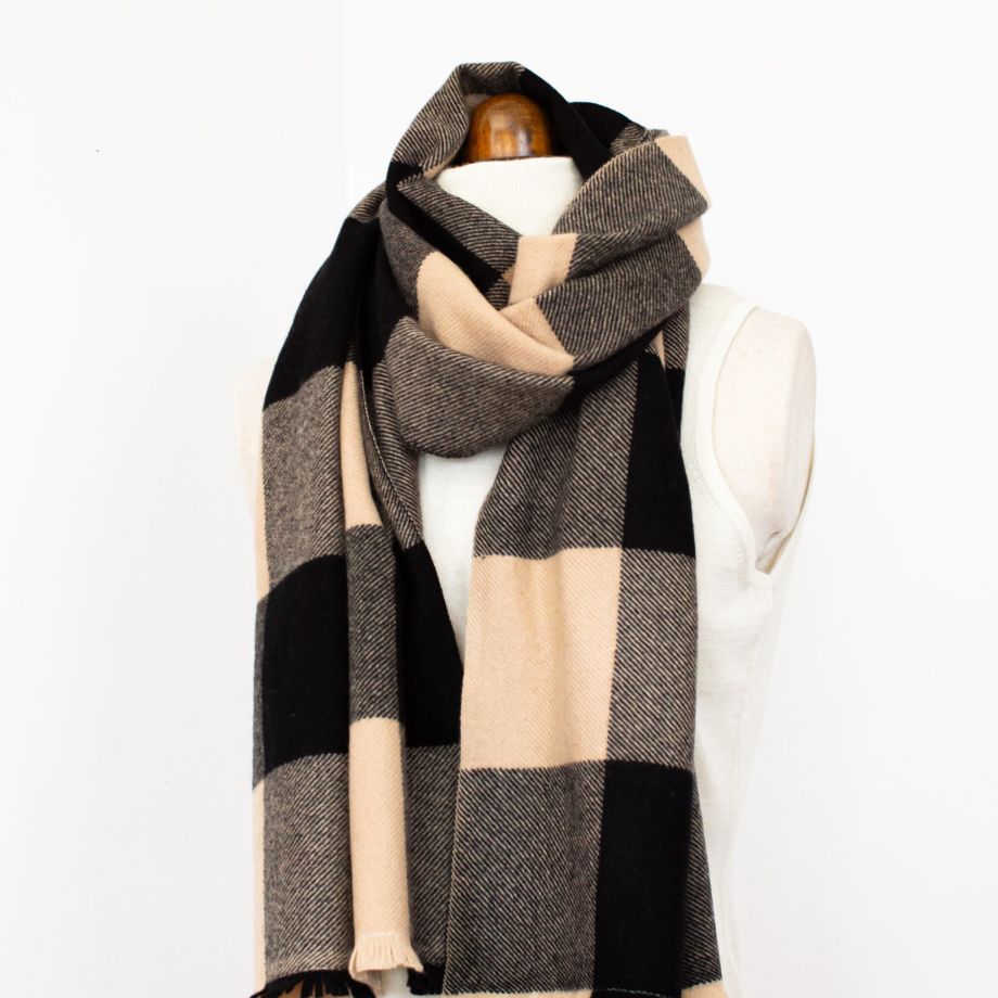 100% Cashmere Scarf, Check Pattern Black Beige Grey